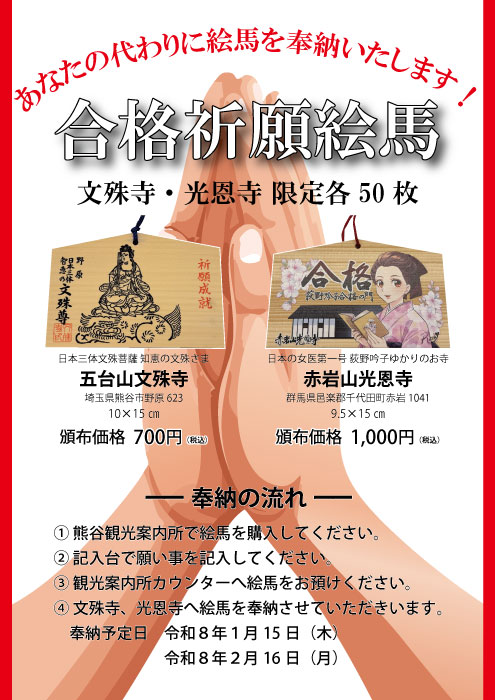 熊谷駅観光案内所で、五台山文殊寺(埼玉県熊谷市)、赤岩山光恩寺(群馬県千代田町)の合格祈願絵馬の頒布、代行奉納を開始しました。