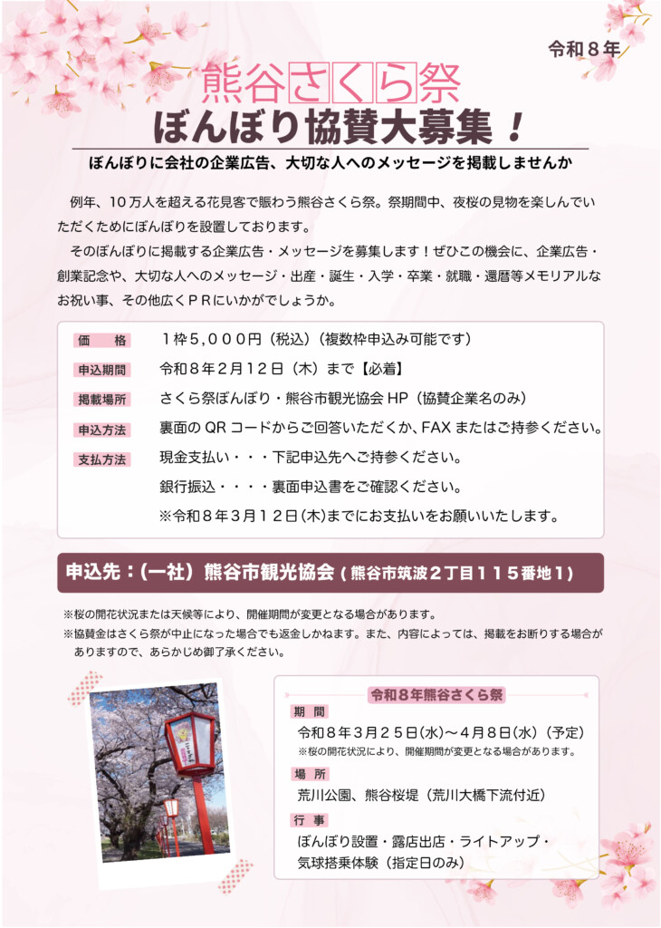 【令和8年熊谷さくら祭】ぼんぼり協賛を募集しています!