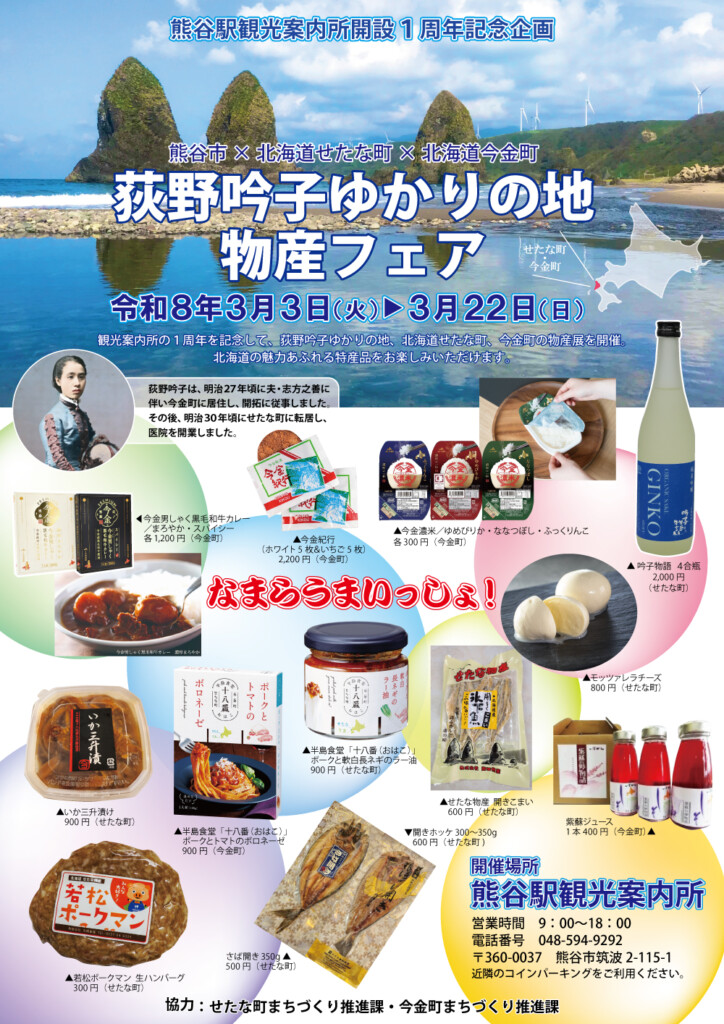 熊谷駅観光案内所オープン1周年記念「荻野吟子ゆかりの地物産フェア」開催!