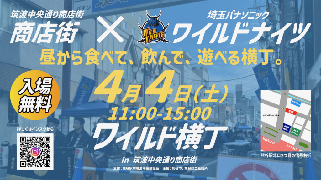 熊谷駅前の筑波中央通り商店街と埼玉パナソニックワイルドナイツのコラボイベント「ワイルド横丁in筑波中央通り商店街」が開催されます!