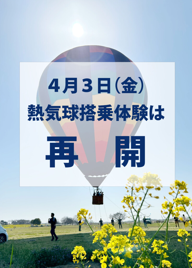 4月3日(金)の熱気球搭乗体験については、10:22現在、再開しましたので、お知らせいたします。