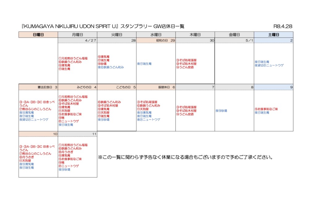 【熊谷肉汁うどんPRキャンペーン】スタンプラリー参加店舗 GW店休日一覧