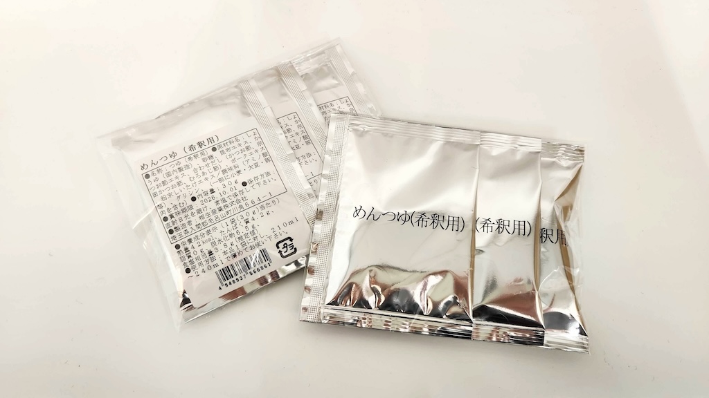 醤油のスッキリした香りと肉汁のコクが広がる専用のめんつゆは3食セットで別売りです。